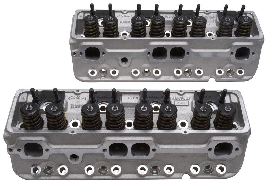 E-210 Cylinder Heads - Pair - CompleteSB Chevy, 64cc chambers, springs for hydraulic flat tappet & roller camsBrand: EDELBROCKPart Number: ED5085Description: The new E-210 cylinder head for small-block Chevy engines provides race-level performance while maintaining full compatibility with OEM equipment. It features larger runners for increased airflow, revised exhaust ports and larger diameter springs for higher lift camshafts, making them ideal for a spec series racer and larger displacement engines. The exhaust port flange is in the stock location to allow for the use of off-the-shelf headers and hardware, while the enlarged valves and ports support the power needed to compete at engine speeds of up to 6500 rpm. The E-210 cylinder head is capable of supporting more than 500 naturally aspirated horsepower, and even more in forced induction applications.