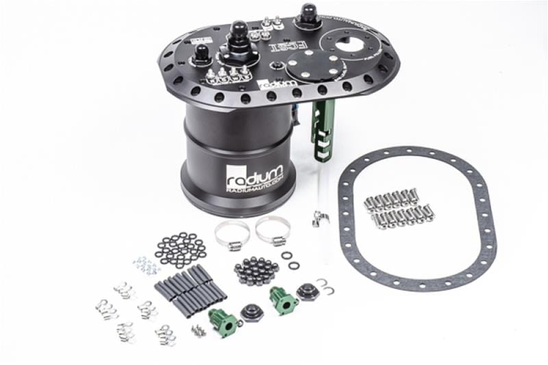 Radium Engineering offers fuel cell surge tanks in a variety of configurations—with (or without) one, two, or three fuel pumps included. The fuel cell surge tank is a drop-in fuel pump system for Radium Engineering's popular fuel cells or any cell that uses the industry standard 6x10 24-bolt fill plate bolt pattern. The tank is designed to protect EFI vehicles that experience fuel starvation. It is NOT a glorified trap door box with baffles. It features a true dual-chamber fuel tank utilizing a single lift pump and up to three surge tank pumps all packaged inside the fuel cell. This provides all the benefits of a traditional external fuel surge tank without safety concerns and plumbing complexity.
