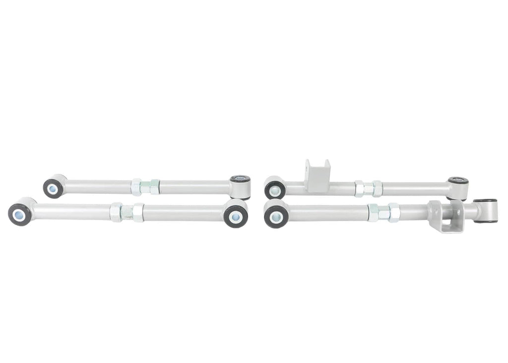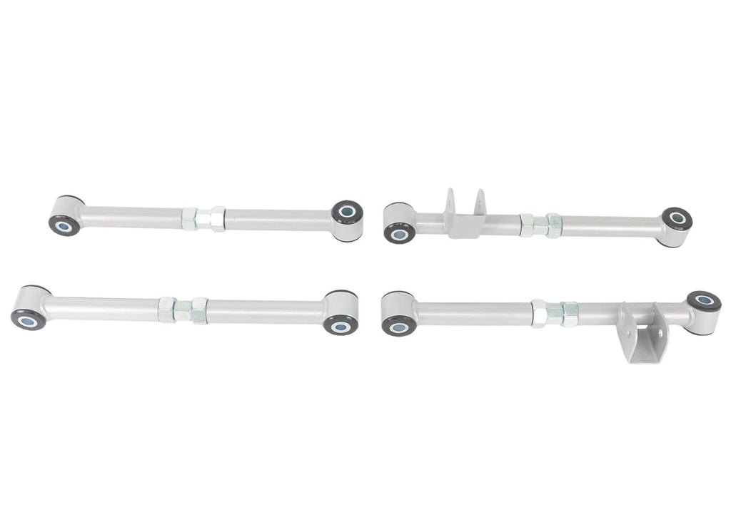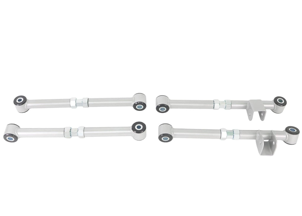 This series of adjustable trailing arms are designed to modify factory camber - toe and track on the rear of Subaru Impreza and Liberty. Use KTA107 as an economical solution for lack of rear toe adjustment particularly on Impreza GD-GH (MY01- on) series. This kit is supplied as 2x adjustable front arms and matching rear arm poly bushings. KTA108 and KTA109 utilise 4 complete adjustable arms with performance low compliance bushings. The result is greater range and more precise adjustment and a more direct connection between body and rear suspension delivering more predictable dynamic behaviour. Left-right-hand thread adjustment turn-buckle nut allows for easy on-car adjustment. This series of adjustable trailing arms are designed to modify factory camber - toe and track on the rear of Subaru Impreza and Liberty. Use KTA107 as an economical solution for lack of rear toe adjustment particularly on Impreza GD-GH (MY01- on) series. This kit is supplied as 2x adjustable front arms and matching rear arm poly bushings. KTA108 and KTA109 utilise 4 complete adjustable arms with performance low compliance bushings. The result is greater range and more precise adjustment and a more direct connection between body and rear suspension delivering more predictable dynamic behaviour. Left-right-hand thread adjustment turn-buckle nut allows for easy on-car adjustment. *All prices shown on the Whiteline website include GST. You will not be charged any additional fees related to tax.